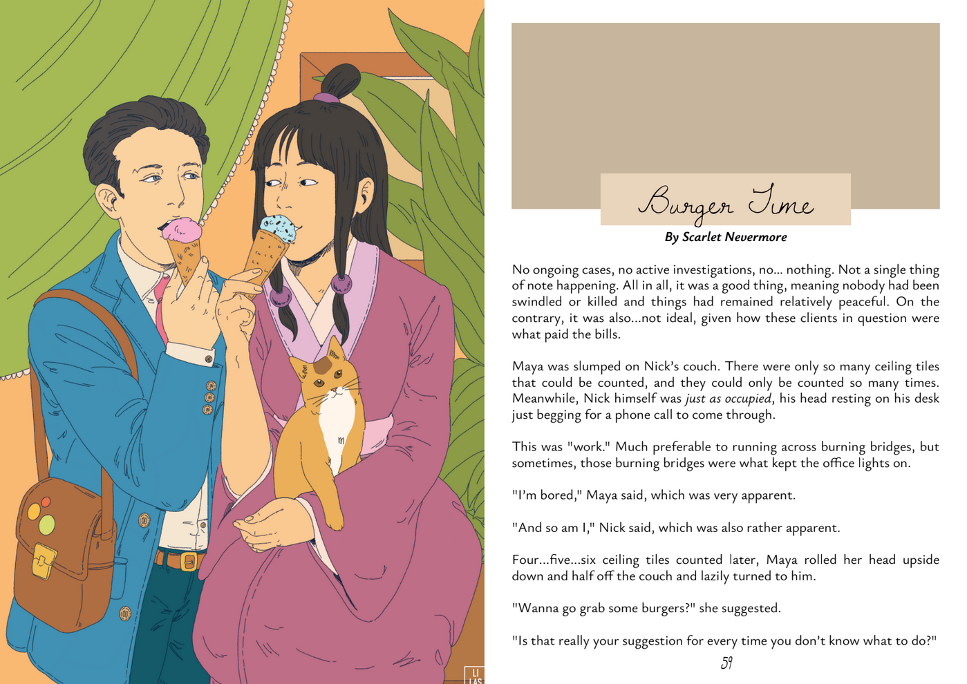 This zine and all its contents make up a non-profit, unofficial derivative work. Ace Attorney and related characters are property of Capcom Co. and are not owned by Through Burning Coals.